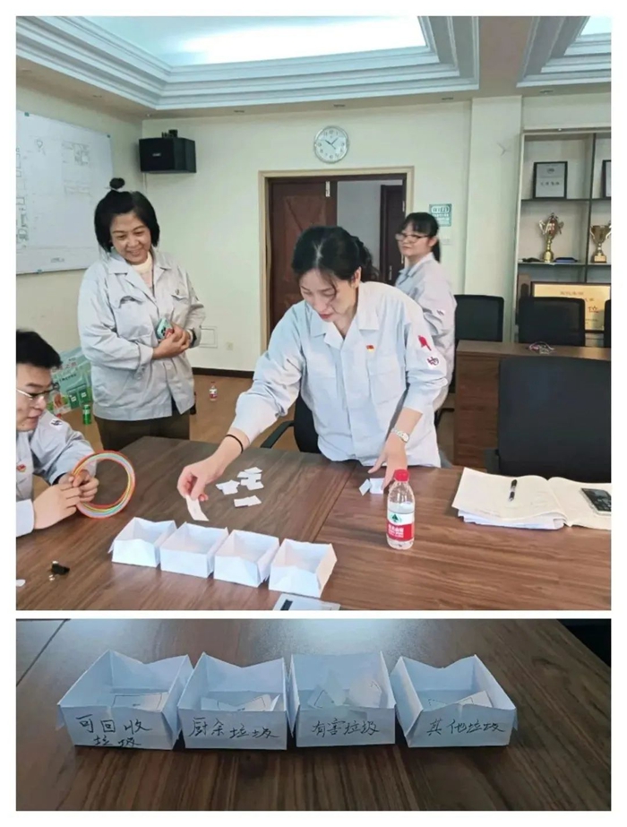 第二黨支部組織開展了“垃圾分類我能行,桶前值守我先行”主題黨日活動,10余名黨員積極參加看桶、守桶、護(hù)桶工作,向職工宣傳垃圾分類知識,引導(dǎo)職工正確分類投放,在踐行垃圾分類工作中敢于叫響“我先來,看我的!”,切實發(fā)揮了黨員先鋒模范作用。