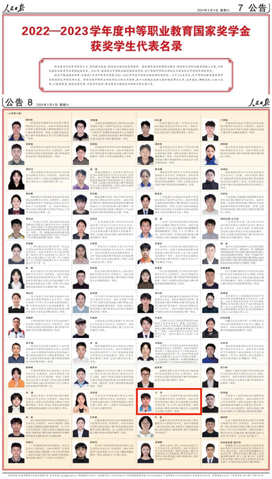5月4日、5日,《人民日報》專版刊登了100名研究生國家獎學(xué)金獲獎學(xué)生優(yōu)秀代表、100名本??粕鷩要剬W(xué)金獲獎學(xué)生優(yōu)秀代表、100名中等職業(yè)教育國家獎學(xué)金獲獎學(xué)生優(yōu)秀代表名錄。北京市工業(yè)技師學(xué)院環(huán)保與生物制藥系2021級環(huán)境保護與檢測專業(yè)學(xué)生王珂,榜上有名。