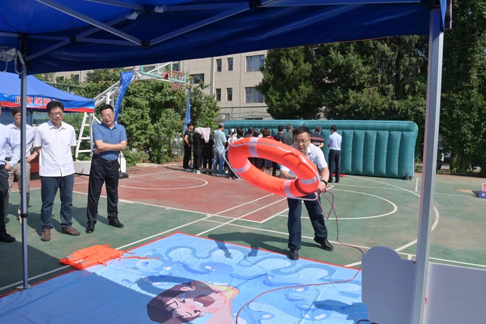 演練結(jié)束后,舉辦方在大廈籃球場開啟安全咨詢體驗(yàn)活動(dòng)。整個(gè)活動(dòng)共設(shè)置了6個(gè)項(xiàng)目,分別為擁擠踩踏應(yīng)急處置體驗(yàn)區(qū)(充氣帳篷)、消防隱患排查試驗(yàn)區(qū)、電動(dòng)車電池穿刺爆燃體驗(yàn)裝置、溺水自救互救教學(xué)培訓(xùn)區(qū)、醉酒交通AR模擬體驗(yàn)、安全標(biāo)志互動(dòng)區(qū)?;顒?dòng)現(xiàn)場氣氛熱烈,盡管天氣炎熱,但絲毫沒有減弱大家體驗(yàn)掌握應(yīng)急技能的熱情。