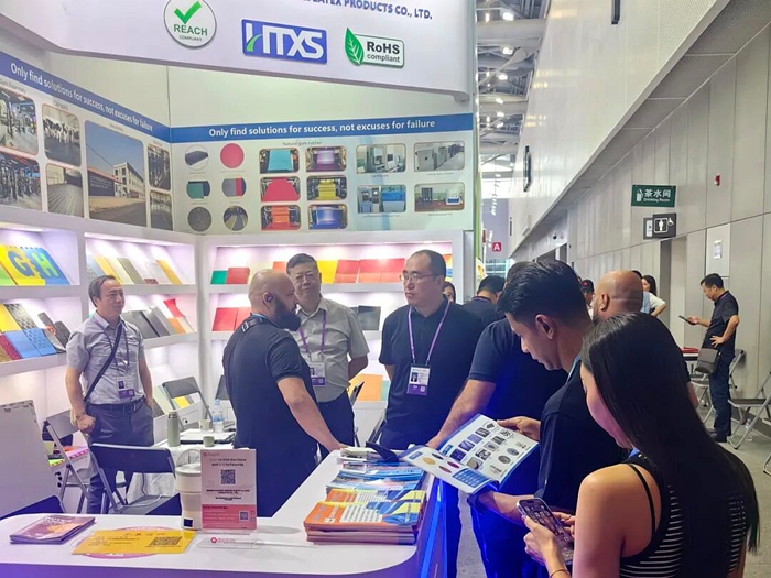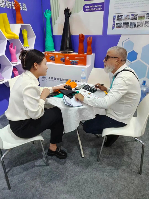 在本屆廣交會第一期,華騰橡塑與瑞京公司聯(lián)袂登場,其中華騰橡塑重點展示了公司創(chuàng)新研發(fā)的濕法混煉天然膠膠板產(chǎn)品;瑞京公司則帶來了“雪蓮”牌專業(yè)工業(yè)用手套系列產(chǎn)品,吸引了眾多國際客戶駐足交流,現(xiàn)場與部分客戶達成初步合作意向并計劃寄送樣品,為后續(xù)深入合作打下良好基礎(chǔ)。