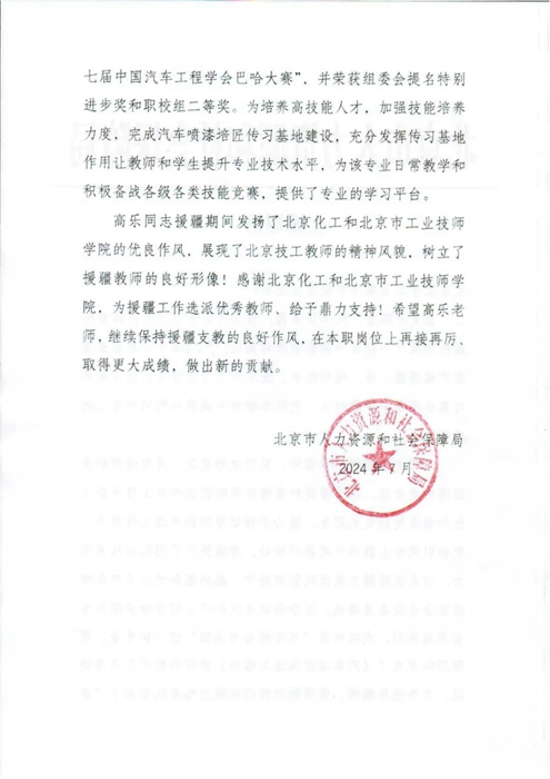 日前,北京市人力資源和社會(huì)保障局發(fā)來感謝信。對(duì)北京市工業(yè)技師學(xué)院教師高樂圓滿完成援疆工作表示誠摯的慰問和衷心的感謝!